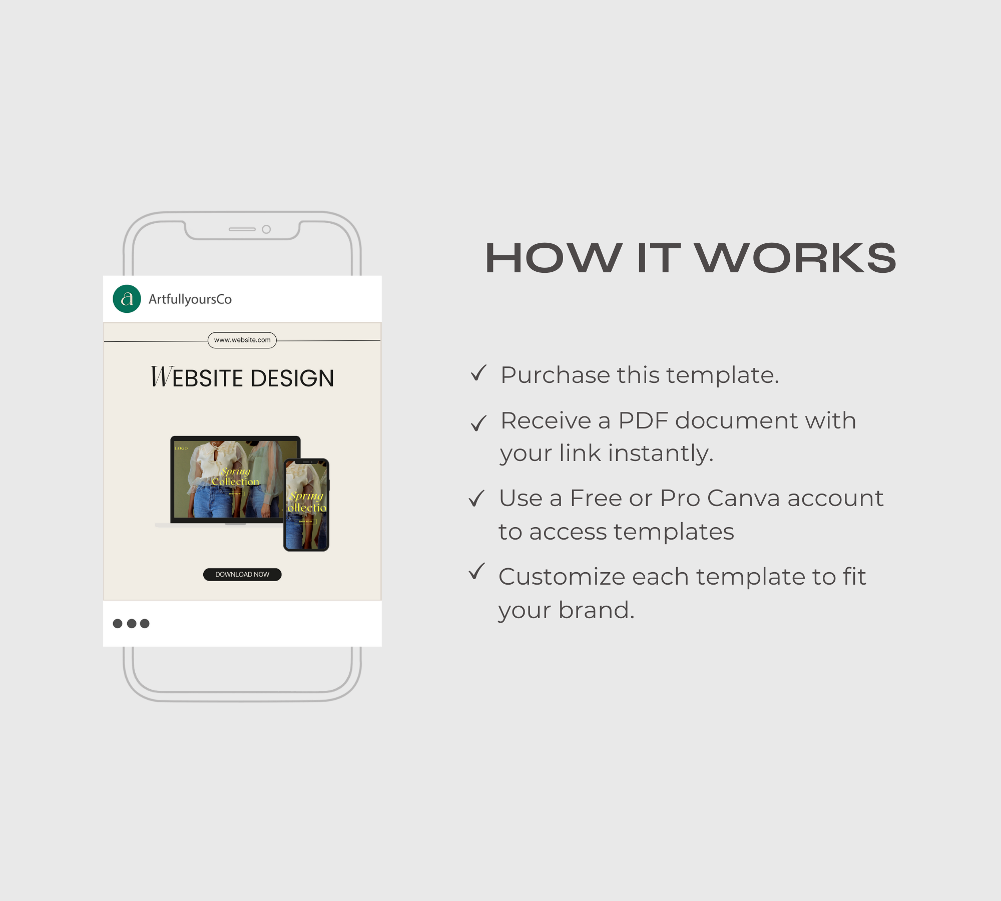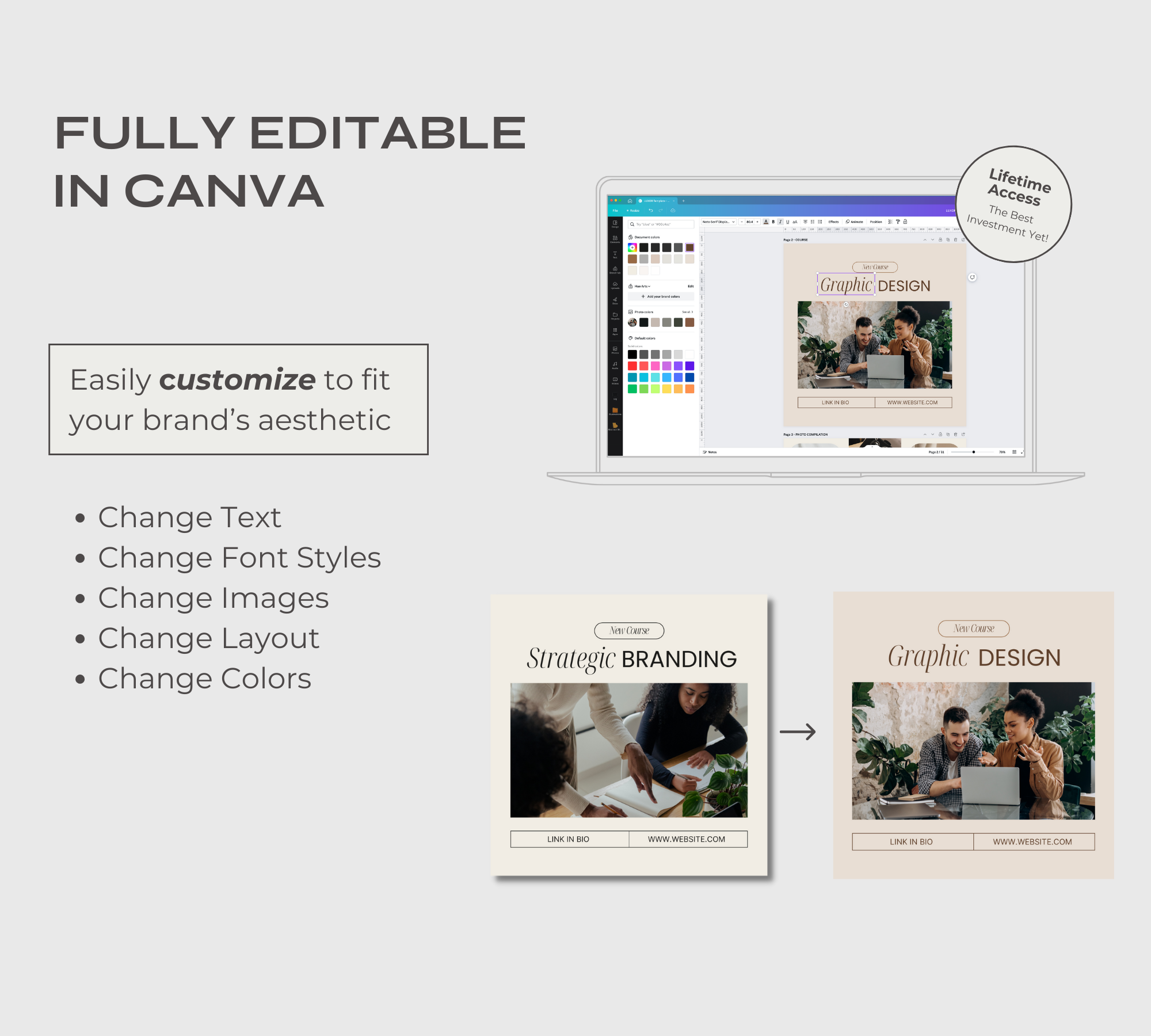 • Step 2: Customize the Template: Upon purchase, you’ll be granted you access to the templates. Personalize the content by rewriting text, adjusting colors, and uploading your own images to make it truly your own. Need help learning Canva? We made an Editing Guide just for you here!